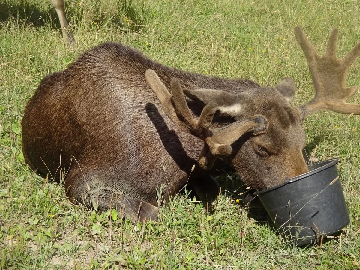 Der Besitzer und Gründer des Elchparkes, genannt: “The moose man” hat uns empfangen und anschließend auf einem Traktoranhänger über sein riesiges Gelände gefahren. Nach kurzer Fahrt haben wir schon den ersten Elch entdeckt. Und was soll ich sagen: Sehr beeindruckende, aber auch niedliche Tiere mit einem behaarten Geweih (was ich vorher nicht wusste). Wir hielten an, 3 Elche gesellten sich zu uns. The moose man begann sie zu füttern und dabei zu erzählen: Als Farmer in dritter Generation ist er an diesem Platz aufgewachsen und hat ursprünglich mit seinem Vater Elche gejagt. Eines Tages fand er ein Elchbaby, dessen Mutter gestorben war. Er entschied, das Kleine mit der Flasche aufzuziehen. Daraus entwickelte sich ein Traum: Er wollte keine Elche mehr jagen, sondern einen Elchpark gründen. Sein Umfeld fand ihn völlig durchgeknallt. Zitat: “But everyone said: You are crazy”. Inklusive seiner Frau. Aber er hat an seine Idee, seinen Traum geglaubt. Stück für Stück hat er ihn verwirklicht. Inzwischen läuft der Park sehr erfolgreich, viele Menschen kommen, um den moose man in seinem ganz besonderen, eigenen Umgang mit den Elchen zu erleben.